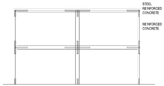 The tests were conducted using cycles of loading and unloading. Tests were performed on a joint between two beams and a column, in which a cyclic loading–unloading test, with no load in the opposite direction, was carried out on the column in order to obtain an understanding of the joint’s behavior. The test was repeated with different sections: reinforced concrete and steel reinforced concrete. The embedded cross-section was only in the joint (see Figure 1).