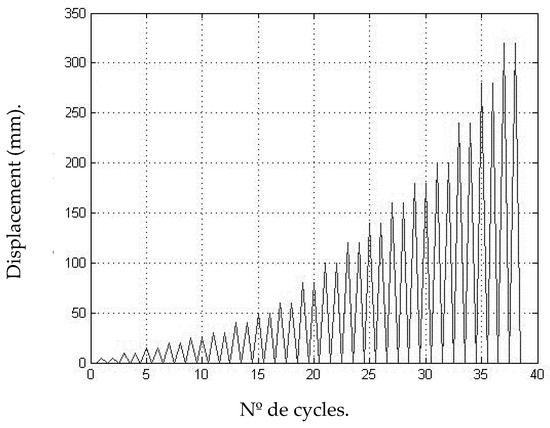Different constructive solutions of the framework’s representative beam were subjected to a cyclic loading and unloading process to obtain an understanding of its real behavior in the elastic and plastic phases up to breakage, which was achieved only in less ductile assemblies. Load is introduced as a displacement imposed at the center of the beam. The displacement values obtained are repeated twice in the load–unload cycles. They increased and progressed in a parabola until the maximum displacement of 330 mm (Figure 4).