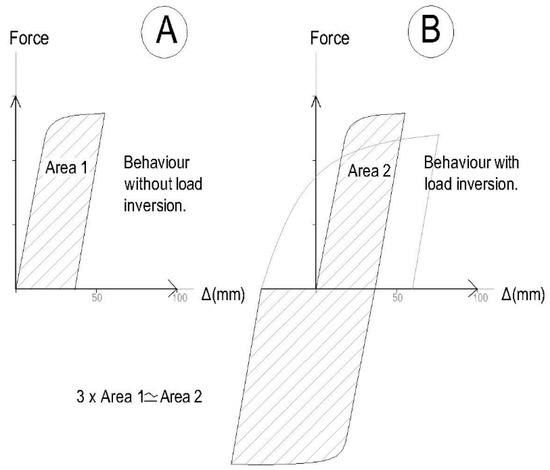 Graph with the tested hysteretic behavior without load inversion (A) and with load inversion (B).