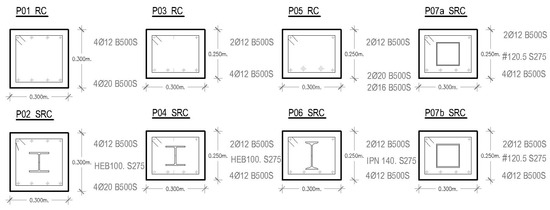 The research conducted by Tong et al. [8] analyzed the behavior of reinforced concrete steel beams using cross-sections in H. In her thesis, Giménez-Carbó [9] analyzed reinforced concrete supports strengthened with steel cross-sections. She performed a thorough literature review in the field of reinforced concrete supports. Reinforcement with L-cross-section steel improves the resistance and ductility of the element, which is a satisfactory solution for reinforcement concrete structures to improve their behavior when experiencing earthquakes. In his thesis, Figueirido [10] studied the buckling behavior of rectangular tubular steel cross-sections filled with high-strength concrete under an axial load using a variable bending movement diagram. Chen et al. [11] investigated over 17 specimens with different solutions of steel cross-sections for concrete. They were composed of L or T steel cross-sections with reinforced concrete. Their force–displacement graphs are comparable to other numerical studies carried out, such as those by Yan et al. [12], who analyzed the hysteretic curves and introduced the attenuation coefficient to represent the effects of seismic damage. They proposed a model that considers seismic damage and compared the model of hysteretic curves with experimental ones.