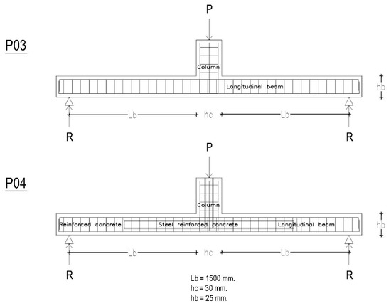 Eight specimens were simulated (Figure 8). Specimens P01 and P02 served to confirm the feasibility of the research line and to adjust specimens P03 and P04 with smaller cross-sections (Figure 8 and Figure 9) in order to ensure that they are better adapted to the maximum load of the test frame. Specimen P03 was a beam with a section of 30 × 25 cm and four reinforcing bars of a diameter of 12 mm. The distance between supports was 3.3 m.