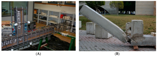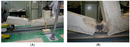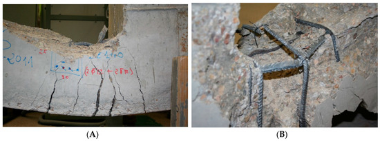 Figure 14A,B illustrates how the concrete in the upper part of the critical section was dislodged by the buckling reinforcements.