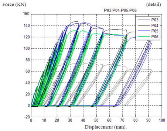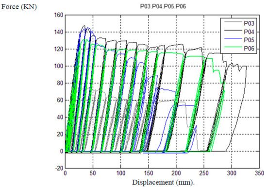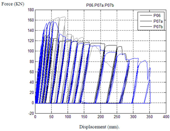 Figure 17 is a summary of the force–displacement envelope curves of the tested specimens P03, P04, P05, P06 and P7b, which were realized to compare the results. Figure 12 and Figure 16 show the real detailed data of the tests with loads and unloads.