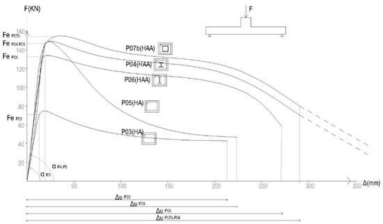 In the pre-break phase the entire section was plasticized. The concrete lost its tensile and compression resistant capacity, and detached from the section. The reinforcements were plasticized and were sectioned and no longer had resistant capacity. The metal profile continued to maintain a certain strength capacity with large deformations due to its high ductility. The neutral axis continued to rise, especially if the reinforcement was plasticized, since to balance any increase in momentum it is necessary to increase the mechanical arm of the internal forces, because these cannot vary. Figure 12 and Figure 13 show the force–displacement results of the tested specimens.