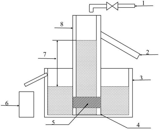 The permeability coefficient of the permeable brick was determined according to ASTM D2434-68 [17] and ASTM C1781/C1781M-15 [18]. The water permeability coefficient test device is shown in Figure 1 [19,20]: