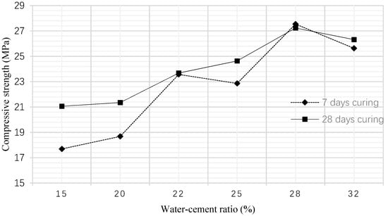As shown in Figure 2, when the water-cement ratio is less than 20%, with the increase of water-cement ratio, the compressive strength of the permeable bricks increases, but the range is considerably small. When the water-cement ratio is about 28%, the compressive strength after seven days (28 days of curing) reaches the maximum, which is 27.54 MPa (27.23 MPa). When the water-cement ratio is larger than 28%, the compressive strength decreases significantly with the increase of the water-cement ratio. This is because when the water-cement ratio is less than 20%, the slurry prepared for water-permeable brick is insufficiently hydrated, its fluidity is weak, the workability of concrete is poor, and concrete vibration and compaction are very difficult. The coating layer and bonding layer on the surface of aggregate particles are not evenly distributed. Therefore, the mechanical performance is relatively weak. When the water-cement ratio is about 28%, the slurry is fully hydrated, the structural layer is evenly distributed, the overall structural stability is reliable, and the effective void ratio of the formed brick is less, so the compressive strength exhibits a maximum value. When the water-cement ratio continues to increase, the cementitious material located at the upper part flows to the lower part of the structural layer under the action of gravity, resulting in blockage of the concrete bottom and the insufficient thickness of the upper surface slurry, which reduces the compressive strength of the permeable brick [4].
