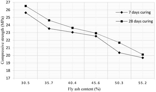 It can be seen from Table 6 and Figure 4 that the fly ash content has a great influence on the compressive strength of the permeable brick. With the increase of the fly ash content, the compressive strength of the permeable brick shows a downward trend. When the fly ash content is 30%, the compressive strength of the 28 days curing permeable brick reaches a maximum value of 26 MPa. This is because of the poor plasticity of fly ash. When the proportion of the fly ash increases, the overall mechanical properties of the shaped permeable bricks are closer to the fly ash, so the compressive strength decreases [9]. Therefore, in subsequent tests, the proportion of fly ash was controlled to 30%.