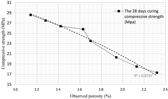 It can be seen from Table 7 and Figure 5 that the compressive strength of the permeable bricks decreases with increasing porosity. This is because when the porosity increases, the contact points and contact faces between the various components of the permeable brick decrease, so it is liable to be destroyed under external force [12]. Fitting the data in Figure 5, it is found that there is an approximate relationship between the compressive strength and porosity of the permeable brick.