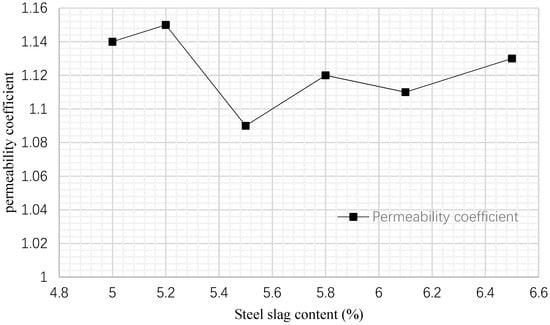 As seen from Figure 6, the permeability coefficient of permeable brick fluctuates between 1.08 cm/s and 1.16 cm/s when the proportion of steel slag content changes, and there is no obvious alteration. This is because the steel slag has a small particle size and is wrapped by fly ash. At the end of the molding, a reasonable space is still left so that the water can still be infiltrated through the pores [5].