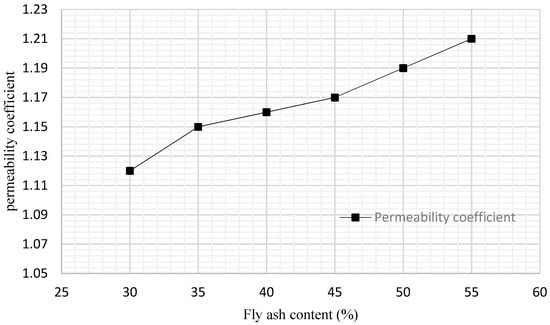 As seen from Figure 7, when the fly ash content rises from 30% to 55%, the permeability coefficient of the permeable brick increases gradually from 1.12 cm/s to 1.21 cm/s. This is because the fly ash particles are mixed with other materials during the slurry forming process to form colloidal particles which have a smaller particle size. No further polymerization occurs between such colloids. When the content of fly ash increases, the number of colloidal particles grows and the space between the particles expands, so the water permeability coefficient also increases [3]. The purpose of this study was to use fly ash and steel slag to make permeable bricks. The key objective was to improve the proportion of fly ash and steel slag in permeable brick as much as possible. When the content of fly ash is 30%, the compressive strength of permeable brick can meet the requirement to use this material.