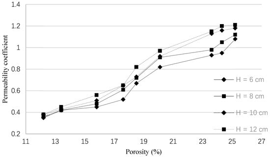 Therefore, porosity had the greatest influence on the permeability coefficient of permeable bricks. When porosity increased from 12% to 25%, the permeability coefficient increased from 0.4 cm/s to 1.2 cm/s.