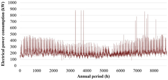 The electricity consumption annual time series for 2016 is presented in Figure 5, as measured by the local electrical grid’s operator. The total annual electricity consumption is calculated at 1,889,198 kWh, while the total annual procurement cost for the same year was 241,889 €, leading to the annual average electricity procurement price of 0.1277 €/kWh. The remarkably high power demand peaks observed in Figure 5, which almost doubled compared to the average hourly values, are due to the main Stadium’s lighting system operation. Finally, the total annual reactive consumption was 388,407 kWh, imposing an annual, average power coefficient of 0.976. Generally, all the monthly average power coefficients are calculated higher than 0.965, obviously, due to the reactive consumptions support with a reactive power compensation panel.