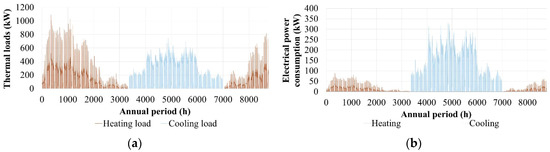 Finally, the location of the Pancretan Stadium next to the shore creates favorable conditions for the coverage of the indoor space conditioning needs with an open loop geothermal system. The computational simulation of the Geothermal Heat Pumps (GHP) operation will be performed with the utilization of seawater temperature annual time series. This time series was provided by the measuring, forecasting and information system “Poseidon”, of the Hellenic Centre of Marine Research (H.C.M.R.). The provided time series comes from a measuring station installed in the open sea, 28.1 nautical miles north from Heraklion and at the depth of 50 m from the sea surface [51]. The annual fluctuation of the seawater temperature is presented in Figure 4b.
