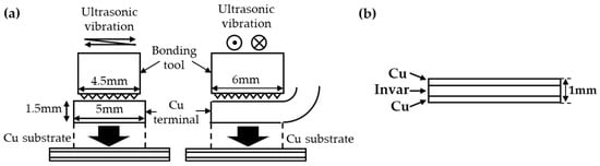 Schematic illustration of the specimen used for the ultrasonic bonding process. (a) The size of the bonding tool and copper terminal. (b) A clad material composed of copper/invar/copper used for the bonding substrate.
