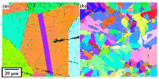 A copper terminal was bonded onto a copper substrate via ultrasonic bonding. As shown in Figure 1a, the short-side direction of the copper terminal was parallel to the ultrasonic vibration. The energy, frequency, load and amplitude applied to the bonding material during ultrasonic bonding were 700 J, 21 kHz, 800 N and 33.2 µm, respectively. As the ultrasonic bonding was finished when the energy reached 700 J, this bonding time was not uniform, ranging from 620 to 788 ms. The copper alloy used for the copper terminal was C1020, and the copper terminal had a thickness of 1.5 mm and an area of 5 × 6 mm. The copper alloys used for the copper substrate were C1020 and C1940. Table 1 provides the chemical composition and physical properties of C1020 and C1940. C1020, an oxygen-free copper alloy, is commonly used in electronic parts. C1940 is a copper alloy used for producing electronic parts with better mechanical properties than C1020. C1940 has higher hardness and a finer grain size than C1020. Figure 2 shows the grain orientation maps of the C1020 and C1940 substrates. The following types of joints were fabricated using these copper alloys: C1020 joints composed of a terminal and substrate made of C1020, and C1940 joints composed of a C1020 terminal and C1940 substrate.