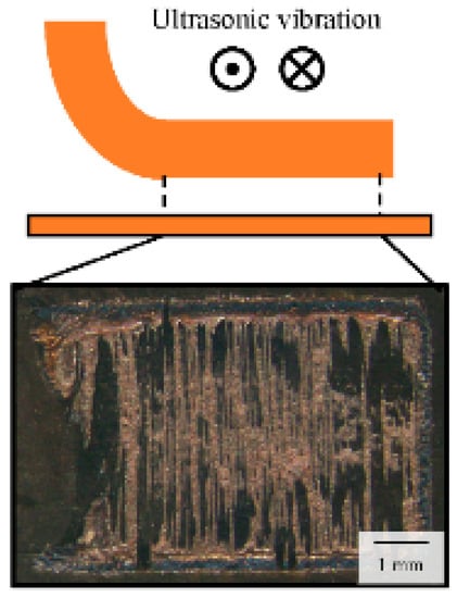 Ultrasonic bonding is one of the solid-state bonding methods, and forms strong joints at relatively low temperatures in a short time and limits these risks [7]. Copper is a valuable material for application in electronic packaging because of its better electrical and mechanical properties than Al, and studies on the ultrasonic bonding of copper in electronic devices have recently been conducted [8]. For example, the copper/copper joints in electronic devices are composed of a copper substrate and wiring material such as a terminal copper wire. Further, the substrate is sometimes composed of plural materials. In this case, the coefficient of thermal expansion (CTE) of the substrate can be expressed using Equation (1):