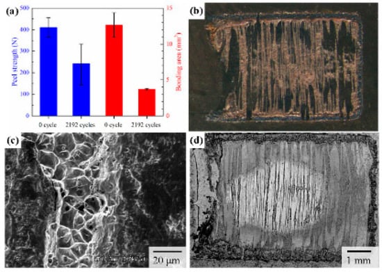 Measurement results of the peel strength and bonding area of the C1020 joints before and after the thermal cycling test. (a) Results of peel strength and bonding area. (b) Representative stereomicroscope image of the fractured surface. (c) SEM image of the boundary of a stripe. (d) Representative backscattered electron (BSE) image of the fractured surface after thermal cycling tests.