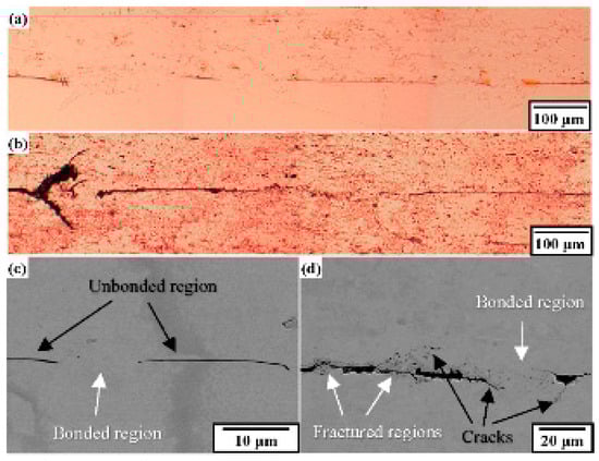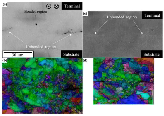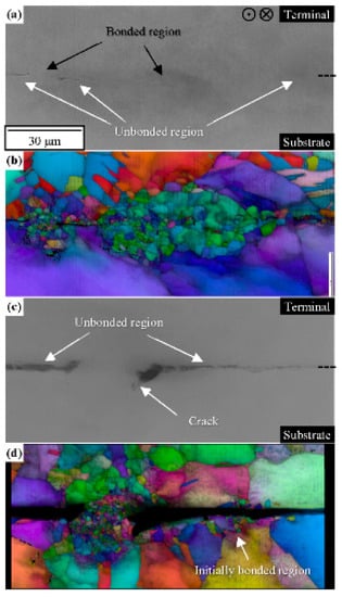 Figure 6 shows SEM and EBSD images of the cross-section of the C1020 joints. Figure 6a,b respectively show the SEM image and IQ + IPF map before the thermal cycling test. The black region at the edge of the bonded region corresponds to the unbonded region. Crystal grains were refined in the bonded region approximately 20 μm above and below the bonding interface. The grain size at the bonded region was reduced to 2.5 μm (bonded region at the left) or 12.1 μm (bonded region at the center) from 46.2 μm on the C1020 substrate or 16.5 μm at the C1020 terminal. These results revealed that ultrasonic bonding induced grain refinement at the interface rather than in the base material. Figure 6c,d show the SEM image and IQ + IPF map after the thermal cycling test. EBSD analysis was performed on not the completely fractured region but the same region during fracturing to evaluate the crack propagation behavior. The cracks were present at the edge of the bonded region. We confirmed that these cracks, initiated from the unbonded region as shown in Figure 5, propagated around the fine grains of the bonded region. On the other hand, cracks propagating in the refined region on the right side corresponded to the initially bonded region. It has been reported that the grain boundary can be an obstacle to crack propagation [13,14]. Therefore, we inferred that the cracks did not propagate into the refined region that had many obstacles and that cracks propagated along a route with few grain boundaries around the fine grain region. When the refined region is narrow, there are few obstacles, and these cannot inhibit crack propagation. This finding suggests that increasing the grain boundary could be effective in suppressing crack propagation caused by thermal fatigue.