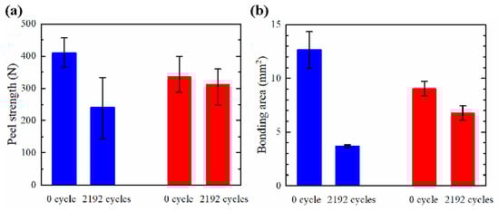 Results of (a) peel strength and (b) bonding area of the C1020 joints and the C1940 joints before and after the thermal cycling test.