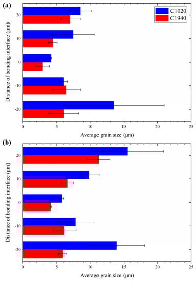 In this section, we discuss the reason why thermal fatigue fracture was suppressed in C1940 joints and not in C1020 joints. Figure 9 shows the average grain size in the vicinity of the bonding interface of both the C1020 and C1940 joints, where the blue and red bars respectively correspond to the C1020 and C1940 joints. The average grain size was estimated as the average value of grain sizes within a region of height 10 μm and the width of the bonded interface. The left axis is the distance from the bonding interface to the center of the region. The direction from the bonding interface toward the Cu terminal is the positive direction.