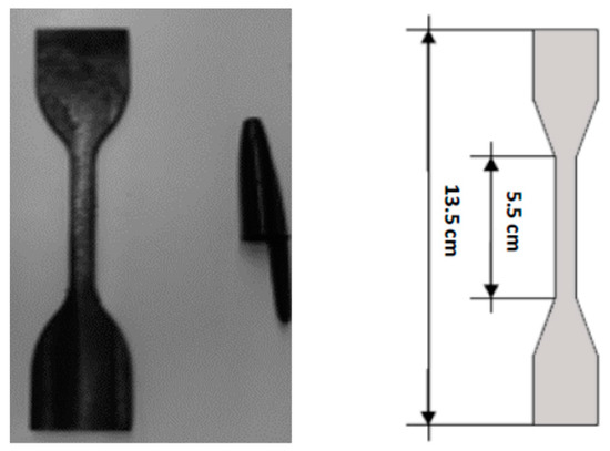 Stress–strain tests were carried out with an Instron 3366–10 kN universal machine (Instron, High Wycombe, UK), following the specifications of ASTM-D-638 type V. The test speed was 20 mm/min. The test temperature was 23 ± 2 °C, and the relative humidity was of 50 ± 5%. The study of mechanical properties, according to the GTR concentration in the matrix and the particle size, included the Young’s modulus, tensile stress, elongation at break, and toughness. Five specimens for testing were used (Figure 1). The mean and standard deviation were calculated for each magnitude, leaving out of account those samples with such a result that was proven to be defective.
