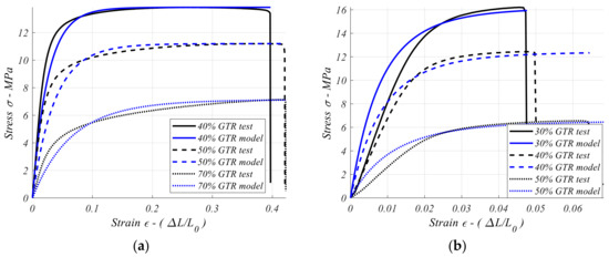 This paper reports laboratory tests conducted on a series of seven polymer matrices blended with an increasing percentage of GTR (0%, 5%, 10%, 20%, 40%, 50%, 70%) in order to evaluate the elastic parameters of the resulting composites. Five specimens (see Figure 4b) were tested until failure for each composite to determine the σ–ε relationship in uniaxial tension. The pure polymer matrix material can be considered as a homogeneous isotropic material [18], resulting in simple relations between the elastic constants: , where is the Poisson’s ratio, G the shear modulus (MPa), and E the Young’s modulus (MPa). The Young’s modulus E is a measure of the stiffness of the material, only for the linear strain–stress behavior. The Poisson’s ratio ν is related to the ratio between lateral and longitudinal strain in uniaxial tensile stress.