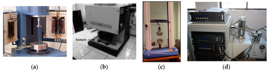 (a) Brabender mixer machine. (b) Specimen stamp machine. (c) Stress–strain tests, (d) Dielectric test.
