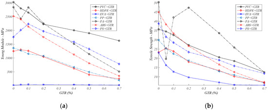 (a) Young’s modulus (MPa), (b) tensile strength (MPa), for seven polymers/GTR concentrations and particle size <200 μm.