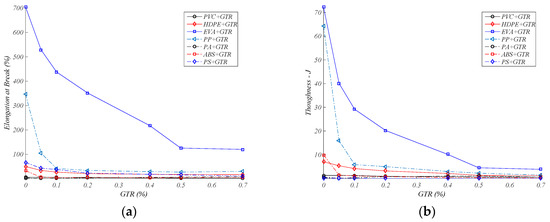 On the other hand, the dielectric parameters are significantly influenced by the GTR content from 20% concentration [31]. The activation energy decreases considerably while the natural relaxation times grow exponentially. This behavior is attributed to the possible interaction between GTR particles when the concentration of these particles is higher than 20%. Basically, it is observed that at the dielectric and mechanical levels, the properties of the pure matrix of the polymer are maintained, approximately, between 10 and 20% contribution of GTR particles. The interaction of the matrix with the GTR particle is rather low, and therefore, it accepts this low content of GTR in its matrix. For values higher than 20% of GTR in the polymeric matrix, both mechanical and dielectric properties decrease dramatically. Comparatively, it can be deduced from the observation of the data resulting from HDPE, PVC, EVA, PP, PA, ABS, and PS with GTR that the analyzed properties of the matrix can undergo some significant changes depending on the amount of GTR that is supplied to the polymeric matrix [32,33], that is, some important properties vary according to the percentage of GTR contributed, so it is concluded in the following: PVC, PP, HDPE, ABS, PS, and EVA with 10–20% of GTR have good results dielectrically and mechanically. Mechanically, it is verified that HDPE, ABS, PS, and PVC behave in a similar way, and the EVA and PP have a more flexible behavior than the rest of the analyzed compounds, and therefore have greater elongation at break.