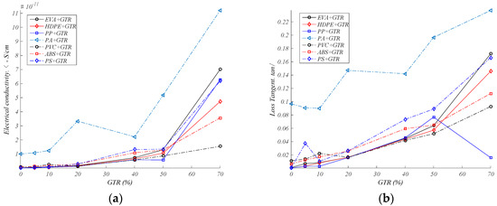 (a) Electrical conductivity (S/cm), (b) Loss Tangent (Tan δ) for different polymers/GTR concentrations and particle size <200 µm, and frequency fixed at 50 Hz and 30°.