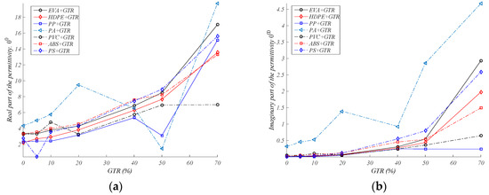 The material with the highest imaginary permittivity is polyamide (see Figure 9b), which without additives of GTR presents values of 1, and it is deduced that the addition of GTR does not affect the imaginary permittivity in this case. Thus, the materials with lower imaginary permittivity are PP, HDPE, EVA, and PS (0.000375, 0.00718, 0.000322 for Tª: 30 °C), followed by PVS and ABS (close to 0.1), and finally with greater imaginary permittivity is the PA (close to the unit); for increases in the proportion of GTR this ratio changes. In low concentrations of GTR, the ε″ is heterogeneous and as GTR is added, the behavior begins to assimilate. In general, the ε″ ranges from 1 to 10−1 for almost all polymers; the addition of GTR increases by an order of magnitude. PVC has a variable behavior of ε″ of up to two orders of magnitude from the addition of GTR (0.49 to 22.96).