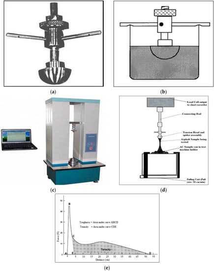This method describes the process for determining the toughness and tenacity of modified asphalt binders by using several apparatuses such as container-metal, which is cylindrical in shape, has a flat bottom, and a nominal capacity of 90 mL and nominal inside dimensions of 55 mm in diameter, 35 mm in depth. Tension Head-polished metal has a hemispherical shape like a spider. The testing machine capable of the uniform movement of 50 cm/min had a minimum load capacity of 0.5 kN, sensitive to 0.005 kN. Moreover, a computer was used to automatically measure the three separate areas under the stress-strain curve to determine toughness, tenacity, and cohesiveness. The testing machine was operated to pull the tension head vertically at a speed of 50 cm/minute for the distance of 75 cm. The extension continued until the asphalt column broke, the curve reached zero force, it stabilized at a constant force close to zero, or until the machine’s extension limit was reached [23].