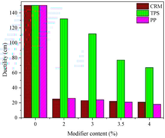 The ductility test was conducted at 25 °C to investigate the tensile characteristics of the modified and unmodified asphalt binders. The results are illustrated in Figure 2 and demonstrate that the ductility of the base asphalt appears to decrease as the modifier content increases dramatically. The ductility value of base asphalt was 150 cm, which was further reduced to 21 cm by the addition of 4% CRM, 18 cm by the addition of 4% PP, and 67 cm by the addition of 4% TPS. The percentage decrease in ductility of the base asphalt value concerning CRM, PP, and TPS were 86%, 88%, and 55%, respectively. These significant reductions in ductility indicate a great loss in the flexibility of the base asphalt occurred by the addition of CRM, PP, and TPS modifiers with a concentration of 2–4% by the weight of each asphalt binder’s modifier. It is observed from the results that the TPS modifier has a high ductility, which means it is more flexible. It is important to note that TPS behaves differently from both CRM and PP, as all concentrations of TPS hold thermoplastics’ elastomer as an essential component, which are commonly hard to melt in bitumen binder. Nevertheless, it was possible for a plasticizer to soluble in virgin asphalt and modified to highly viscous bitumen of a high-quality.