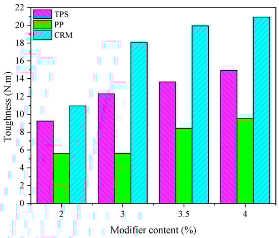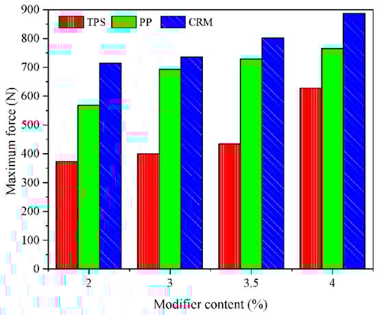 The effect of CRM, PP, and TPS contents on toughness and the maximum force of asphalt binders are illustrated in Figure 4 and Figure 5, respectively. Figure 4 shows that toughness is increased linearly with an increase in modifier content. CRM has the highest toughness, followed by the TPS and PP modifiers. Thus, the capability of the CRM-modified binders to resist the permanent deformation is better than the TPS- and PP-modified binders. Moreover, our results indicate that CRM has a higher dissipated energy during the fracturing process. Thus, the higher the dissipated energy in the fracture, the better the asphalt mixture quality is. Concretely, CRM is the best modifier for enhancing the mechanical performance than both the TPS and PP modifiers.