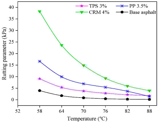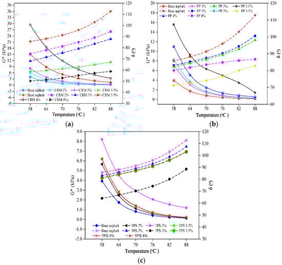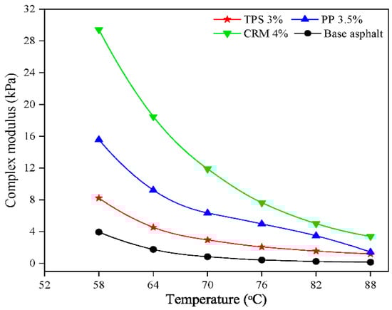 It can be noted that the addition of CRM, PP, and TPS increased the G*. With respect to the base asphalt, the increase in the complex shear modulus (G*) in each modified binder indicated the degree of change in the structures and compositions of bitumen, which allowed for the modifiers to influence the mechanical properties of the modified bitumen. The G* values decreased with the temperature increased as illustrated in Figure 7. The results demonstrated that the G* value increased when TPS concentration increased by 3% and then decreased. Meanwhile, the G* increased when PP concentration increased by 3.5% and then reduced. Therefore, the 3% and 3.5% represent the ideal percentages of the TPS and PP modifiers to enhance the medium- and high-temperature performance. The G* value increased with CRM concentration and increased for all CRM contents from 2 to 4%. Note that Figure 6 and Figure 7 are plotted from these ideal percentages.