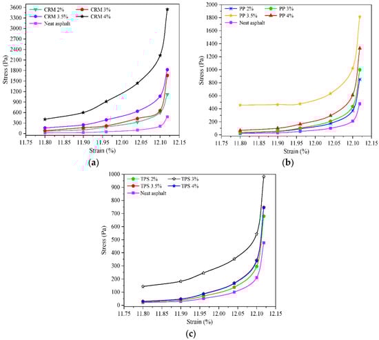 Figure 8a–c shows that the stress-strain relationship of the modified bitumen binders demonstrates a significant difference. The relationship increased with the addition of CRM, PP, and TPS modifiers. Therefore, the dosage of the additive has vital importance in medium- and high-temperature properties.