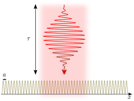 Schematic view of an external laser-driven periodic structure. The duration of the pulse is denoted by and the lattice constant of the 1D crystal is given by a. Note that, usually, the central wavelength of the incoming laser pulse is larger than , meaning that dipole approximation can be used.