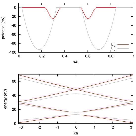 Top panel: The model potentials (red curve) and (grey curve) as a function of the coordinate x in a unit cell. The corresponding band schemes are shown in the bottom panel (where an additive scaling factor has been used in order to see more clearly that the band gaps are the same).