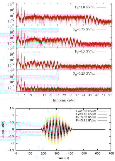 The HHG spectra that can be obtained as described above, show a weak dependence on the number of the conduction bands that we take into account. According to our experience, for moderate exciting field intensities, a four-band model (VB + 3CBs) is sufficient in the sense that in adding more CBs, the results practically do not change. (Note that a peak field strength of GV/m, together with a focal spot size of around 50 microns and additional pulse parameters given in the caption of Figure 3, means pulse energies of the order of 0.01 mJ). Additionally, in order to see the physical meaning of the relevant parameter ranges, it is worth providing the ratio of some important energies and frequencies. For a peak field strength of 1 GV/m (that corresponds to 1.33 × 1011 W/cm2 peak intensity) and a characteristic lattice constant of 5 Å, the Bloch frequency has the same order of magnitude as at microns. is 7.7 times smaller than the minimal bandgap (3.2 eV), and more than 50 times smaller than the maximal bandgap (for both potentials). Considering to be the characteristic laser-induced energy, we find that it has the order of magnitude of a few eV, which is considerably below the binding energy of both of the potentials—see Figure 2.