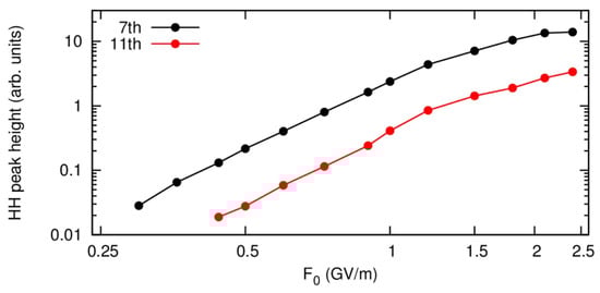 The height of the seventh and 11th high harmonic peak as a function of the peak field strength of the external field. (Please note the log–log scale.)
