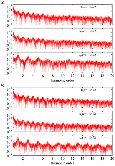 Focusing on the practical absence of the even-order harmonics from the spectra, Figure 5 provides an explanation. As we can see, HHG signals corresponding to a given value of k contain all harmonics with approximately the same weights. However, as the example of Figure 5 shows, when we combine the current densities that result from the time evolution of a given k and its opposite, the even harmonics tend to disappear. That is, the fields emerging from the time evolution of states that—without the external field—have phase velocities with the same magnitudes but opposite signs, interfere constructively for the odd harmonics, and destructively for the even ones. Additionally, this result does not depend on the particular choice of the model potential U, since it is visible for both and .