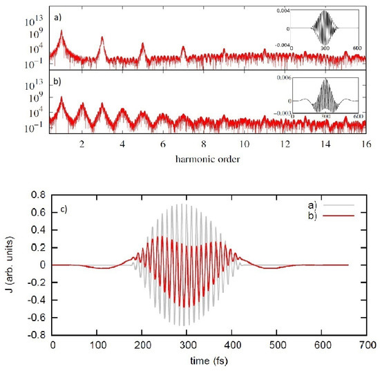 The appearance of even-order harmonics. Panel (a) infrared excitation, panel (b) THz assisted infrared excitation. The time dependences of the vector potentials of the exciting fields are shown by the insets, where the units for the horizontal and vertical axes are fs and GV·fs/m, respectively. Panel (c) shows the current density J, which is the source of the HH radiation.