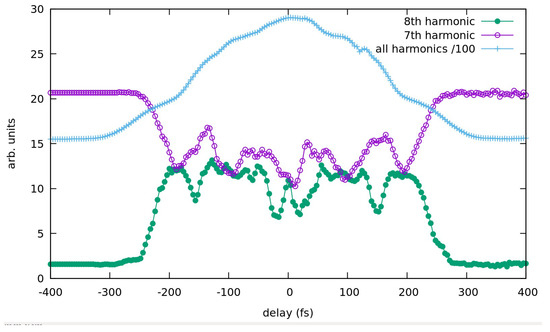 In order to see this in more detail, we investigated the role of the delay between the THz and the infrared pulses. (Note that this delay was zero for Figure 6.) As we can see in Figure 7, when there is no overlap between the pulses, the strength of the harmonics are practically the same as without the THz radiation, regardless of the sign of the delay. This underlines the fact that it is the infrared radiation that produces high harmonics, and the THz pulse itself is not intense enough in this sense. However, the overall HH gain increases when the pulses considerably overlap—it has a maximum at zero delay, that is, when the peak value of the net electric field is maximal.