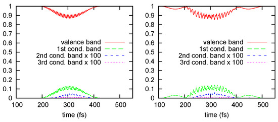 where the second term on the right-hand side forces the population toward the valence band with a rate of , and destroys the off-diagonal matrix elements (quantum mechanical coherences) with a rate of . (Note that these effects do not change the index either.) For the calculations presented here, the diagonal and off-diagonal relaxation rates are and , respectively. Note that is the inverse of the dephasing time , that can be estimated to fall within the range of 15–50 fs for low-energy electrons [47], but can be as short as a few fs, such as for the case of a strong longitudinal phonon–electron interaction in SiO [48]. Although, according to our best knowledge, scattering rates for hot electrons have never been measured directly, fs have often been used in theoretical calculations, such as in [49,50]. This is in agreement with our current choice. The diagonal relaxation described by describes energy relaxation, which is a slower effect that usually plays a less significant role on the fs timescale, but for the sake of completeness it is worth including it as well. As one can check, using the dipole approximation and velocity gauge, will always be diagonal in the index —that is, the dynamics only mix the band indices (”vertical transitions”), but not different values of .