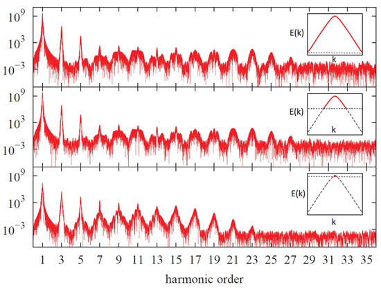 As a demonstration, Figure 9 shows how the net HHG signal and the physically measurable cutoff is being built up as a superposition of the individual contributions from different values of k that cover intervals of increasing sizes around . (The corresponding parts of the valence band are schematically shown by the insets.) Note that, as we saw in the previous subsection, the symmetry of these intervals around zero provides the dominance of the odd-order HHG peaks in the spectrum over the even-order ones. As we can see, although a narrow interval of k values around 0 can produce qualitatively correct HHG spectra, the combined effect of practically all states is needed for the spectra that can be detected.