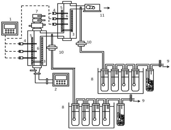 Two-stage fluidized bed gasification system. 1. Programmed logical controller (PID); 2. Mass flow meter; 3. Distributor; 4. Thermocouple; 5. Electric heater; 6. Gasifier; 7. Manual feeder; 8. Impingers and cooling system; 9. Sampling pump; 10. Glass filter; 11. Induced fan.
