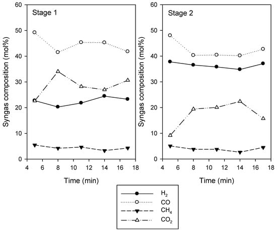 Synthetic gas compositions in the two-stage fluidized bed gasifier. (Stage 1: 800 °C and Stage 2: 900 °C, ER = 0.3, S/B = 0).
