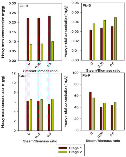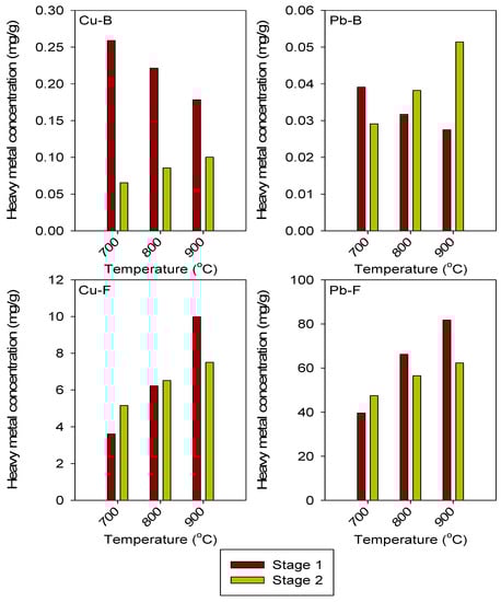 The comparison of heavy metal concentrations in fly ash between stage 1 and stage 2 under different operating temperatures are displayed in Figure 3. It can be seen that at a higher gasification temperature in stage 1, the content of Cu and Pb in fly ash both trended upward since high temperature facilitates the volatilization of heavy metals, leading to the escape of heavy metals deposited on fly ash through homogeneous nucleation and heterogeneous nucleation [22]. Therefore, a higher temperature will result in an increase in the heavy metal content of fly ash. As expected by their difference in volatility, according to the results, the order of the amount of the two heavy metals in fly ash was Pb > Cu. The amount of heavy metal that can escape is mainly related to the heavy metal’s own volatility. According to the fly ash results shown in Figure 3, the Cu and Pb concentrations in fly ash were higher in stage 1 than in stage 2 when the temperature of stage 1 and 2 was 900 °C. This phenomenon is due to the increased emission of Cu and Pb in stage 1 when the temperature of stage 1 was up to 900 °C. The amount of Cu and Pb condensation on the fly ash in stage 1 was increased; therefore, the concentration of Cu and Pb in fly ash in stage 1 was also increased. On the other hand, the emission of Cu and Pb declined, and the amount of the Cu and Pb condensation on the fly ash in stage 1 decreased when the temperature of stage 1 was lower than that of stage 2. As a result, the concentration of Cu and Pb in fly ash in stage 1 was lower than that in stage 2.