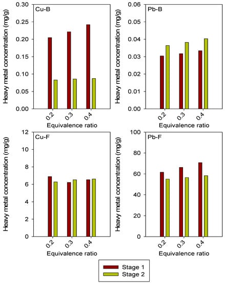 Figure 3, Figure 4 and Figure 5 compare the three different operating conditions examined in this study (temperature, ER, and S/B). Regardless of whether the focus was the heavy metal distribution in the bed material or fly ash of stage 1 or stage 2, the major influencing factors were the operating temperature and the heavy metal’s own volatility; the ER and S/B had less influence. In addition to stage 2 bed material providing a second opportunity for the syngas to undergo oxidization or cracking to increase the H2 yield, it also could entrap gaseous heavy metals or particles containing heavy metals that entered the stage 2 fluidized-bed gasifier through filtration and chemical adsorption by bed particles, thus reducing the escape of Cu and Pb.
