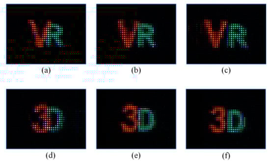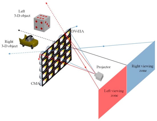 - Jeong, J.; Lee, C.K.; Hong, K.; Yeom, J.; Lee, B. Projection-type dual-view three-dimensional display system based on integral imaging. Appl. Opt. 2014, 53, 12–18. [Google Scholar] [CrossRef]